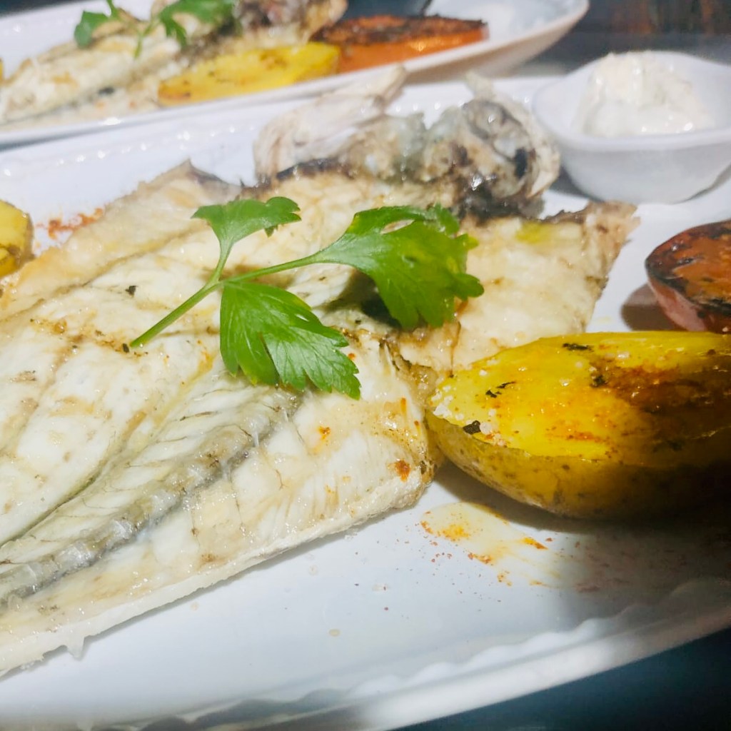 Rodaballo de ración (500g) en parrilla de leña con guarnición de patata asada y tomate rodaja. 21,00€